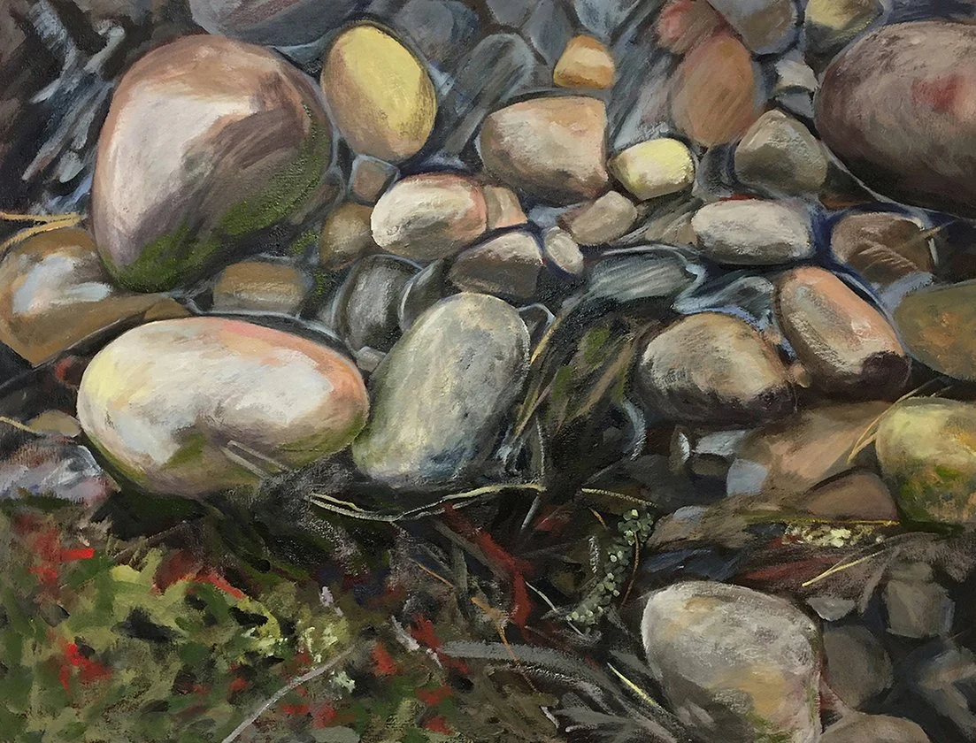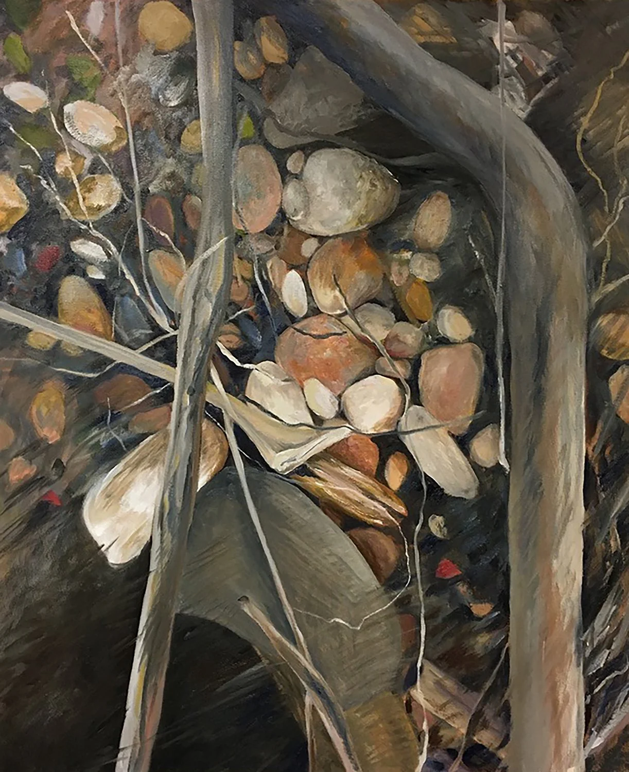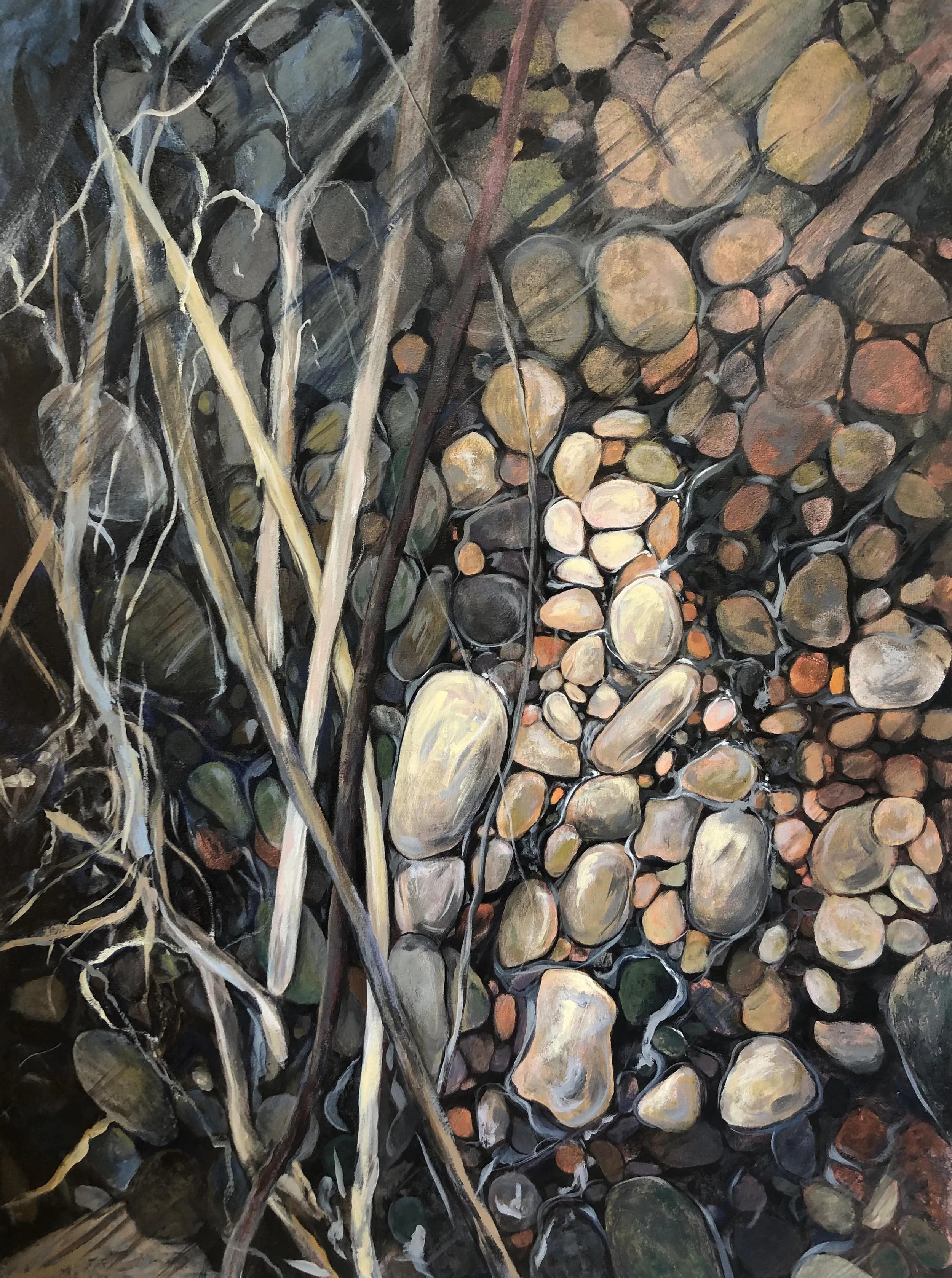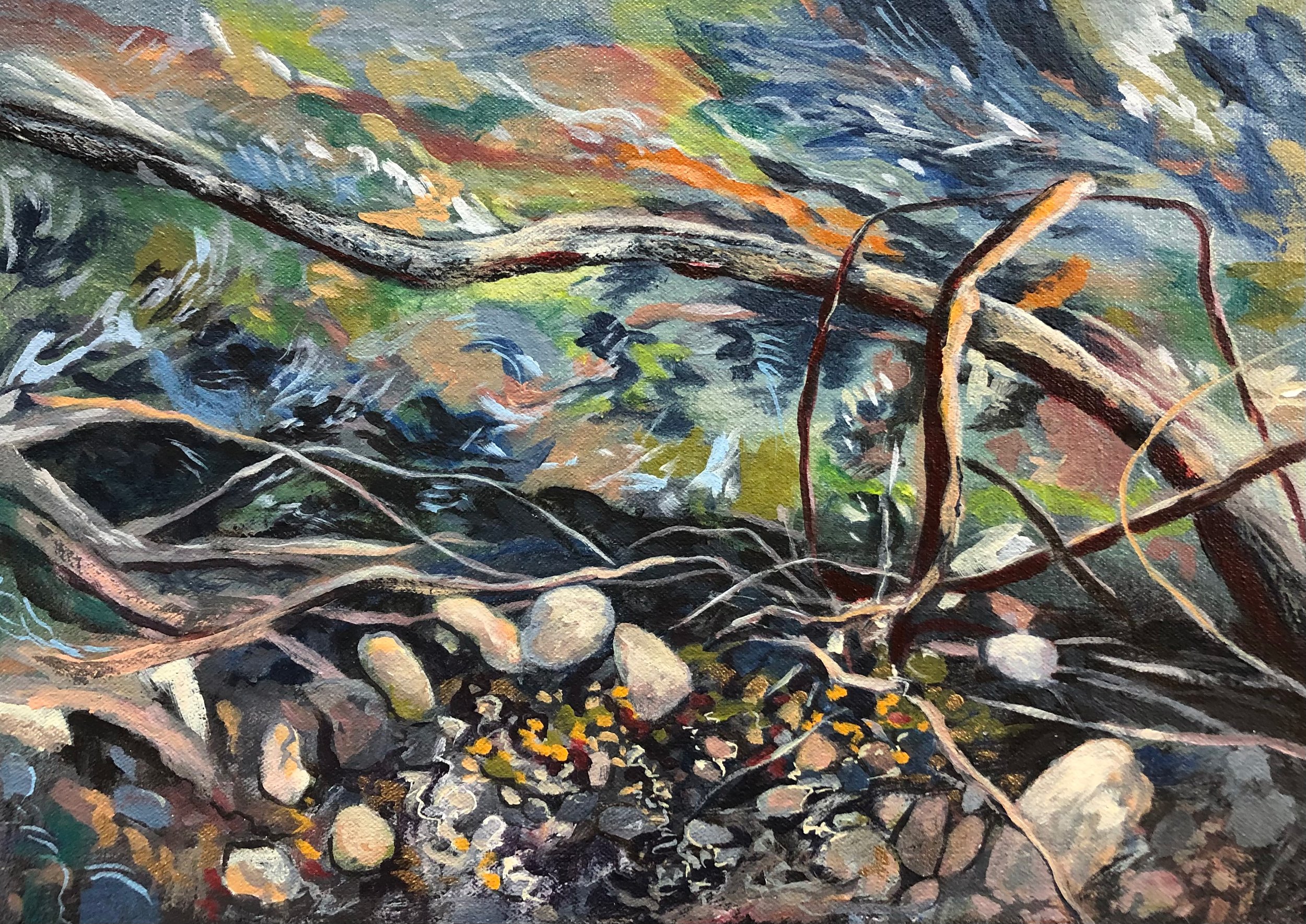 This work, representational in style, serves as a direct and intimate reflection of my experiences within the riparian zones along lakes and rivers that I have canoed and and forest floors hiked through. Each painting captures a micro moment in both space and time, revealing the intricate and rich life that thrives within these delicate environments.