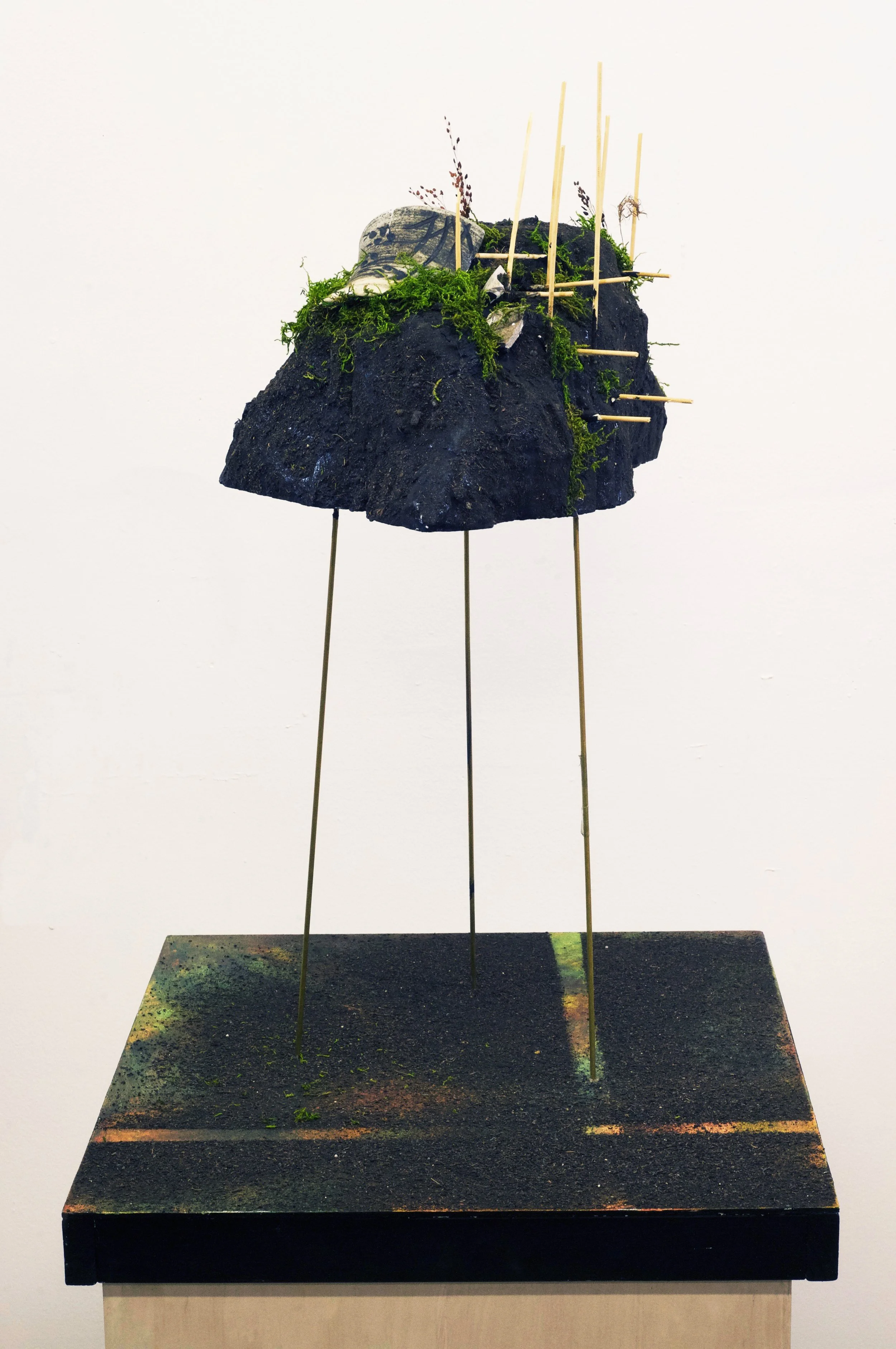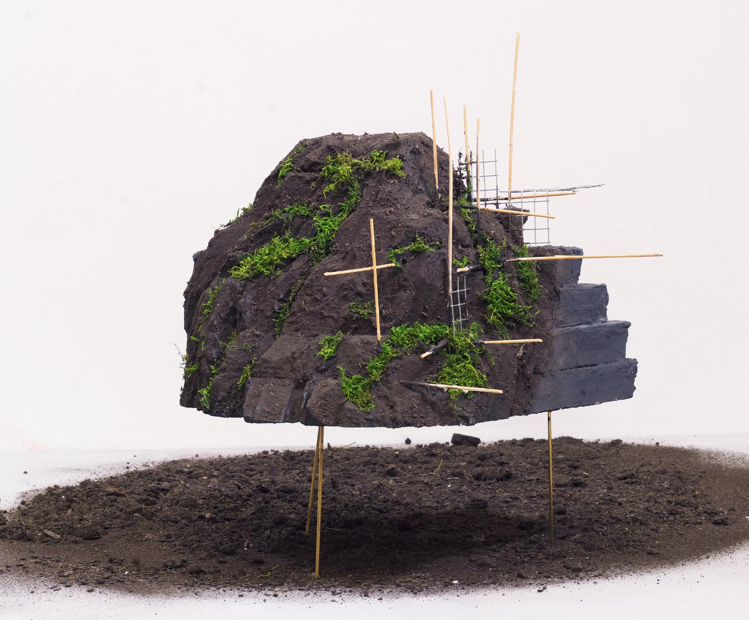 A standing sculpture of organic, and man made building materials including styrofoam, wire, wood, and plaster sit upon a platform that is painted with multiple colours, and dusted with dirt that has traces of masked out lines.