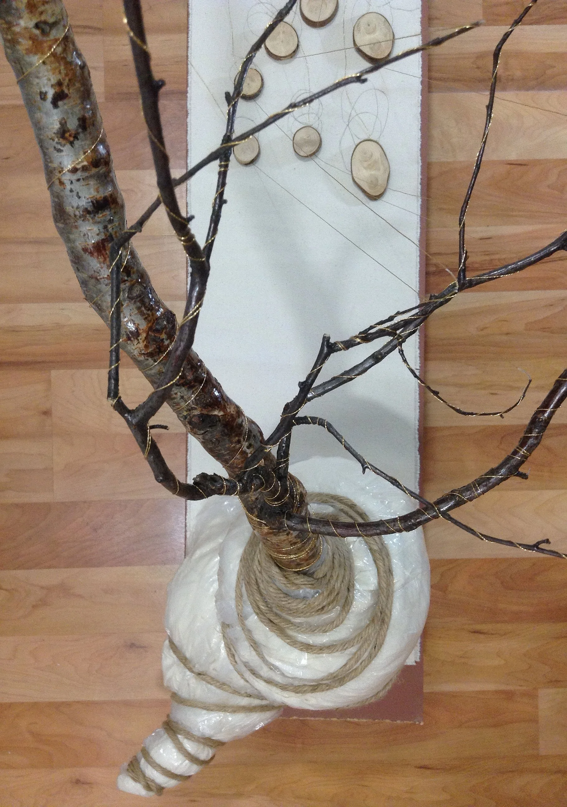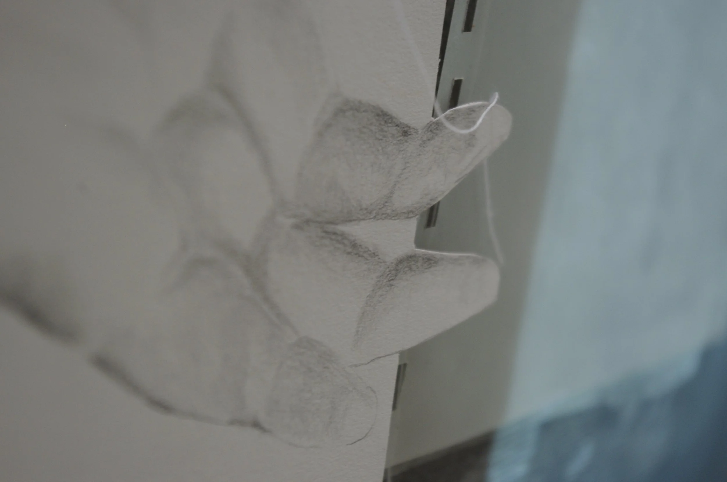 Braille pages from a children’s book are meticulously laid out in a structured grid, interspersed with subtly sketched images of hands captured in simple open and closed gestures. These symbolic elements represent the intricate systems established to shape our sensitivity and nurture our relationships with the world surrounding us. A projected animation of the sketched hand plays on a continuous loop, casting its ethereal light over a tree branch resting on a rectangular piece of board scattered with braille pages, evoking a sense of intentional disorder. A delicate cluster of gold thread extends gracefully from a grasping hand to the finer twigs of the branch, wrapping tenderly down and around its length, which is richly adorned with gold leaf. These connective threads carefully and elegantly hold the piece together, creating a striking bridge that harmonizes the dynamic tension between chaos and order.