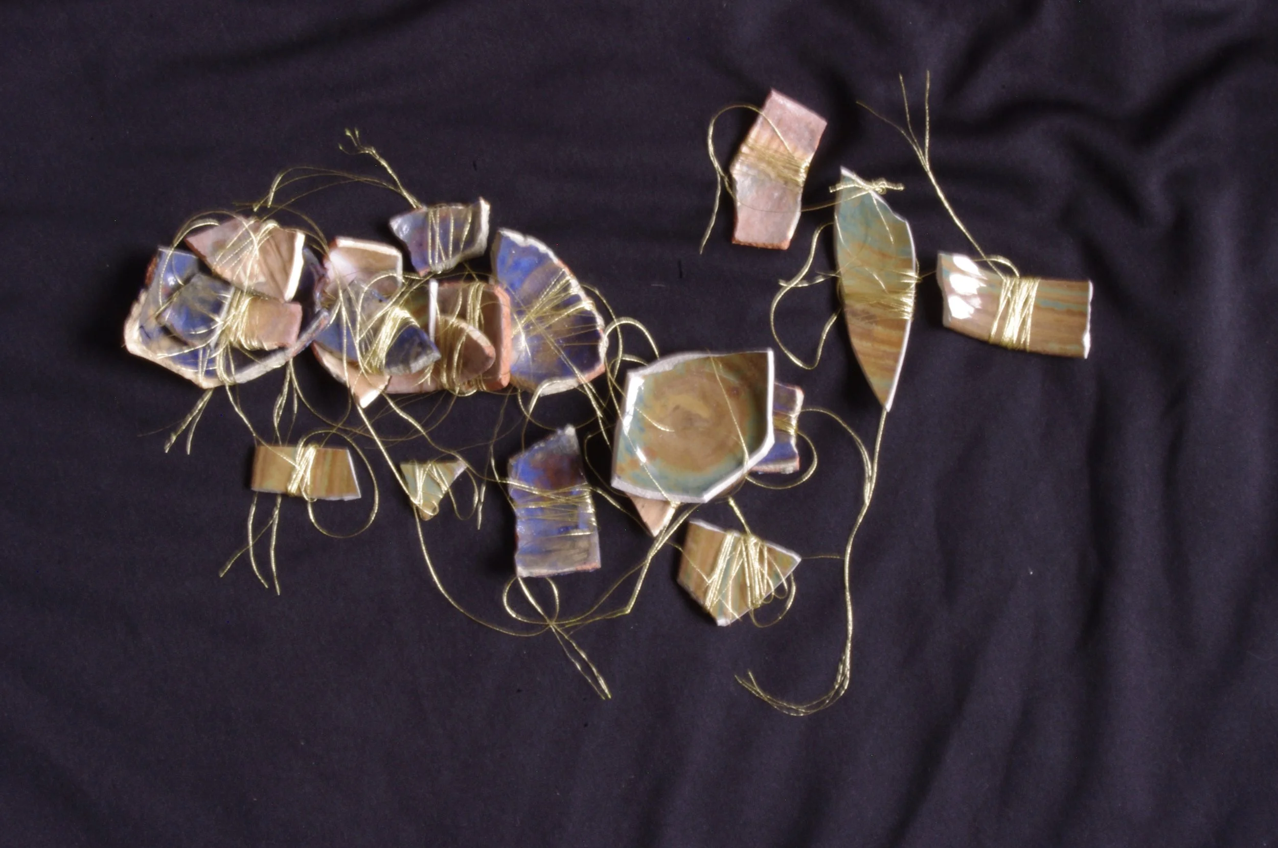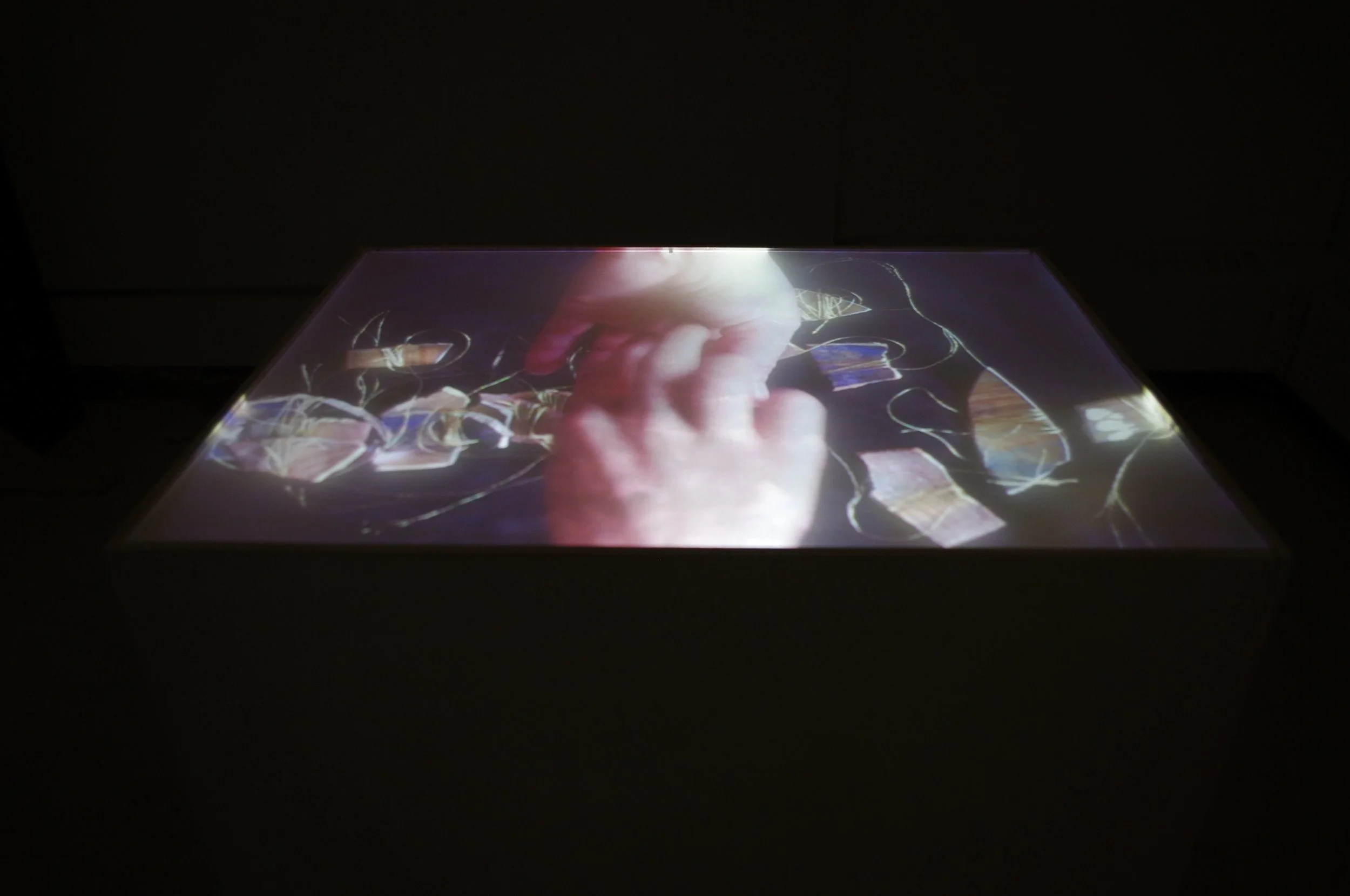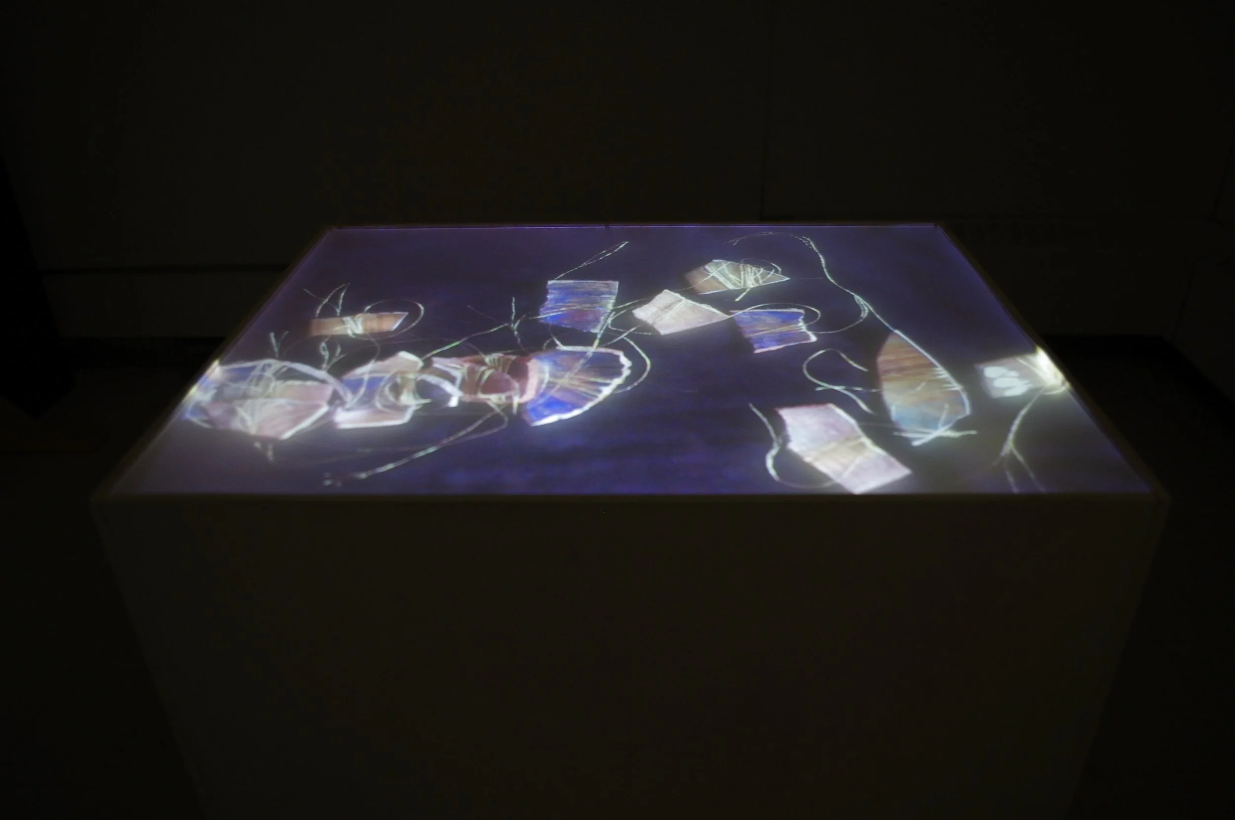 A simple white plinth sits quietly in an austere room, dimly and darkly lit to accentuate its solemn presence. The moving image displayed atop the box feels almost unnatural, not projected from above as one might expect, but instead emanating from an indeterminate source that stirs curiosity. It depicts what appears to be an intimate moment between a younger and an older person, engaged in an unfamiliar and delicate activity that gently draws the viewer’s attention. The older hands carefully wrap fine gold thread around fragmented pottery, handing the precious pieces over to the younger hands, who then place the meticulously wrapped shards onto the surface below with reverence. The scene unfolds like a game, yet carries the weight of a craft — almost ritualistic in nature. Soft domestic sounds of a distant home—dishes clinking as they are washed, children’s play echoing faintly—permeate the background, barely audible but grounding the piece in a lived, tactile reality.
